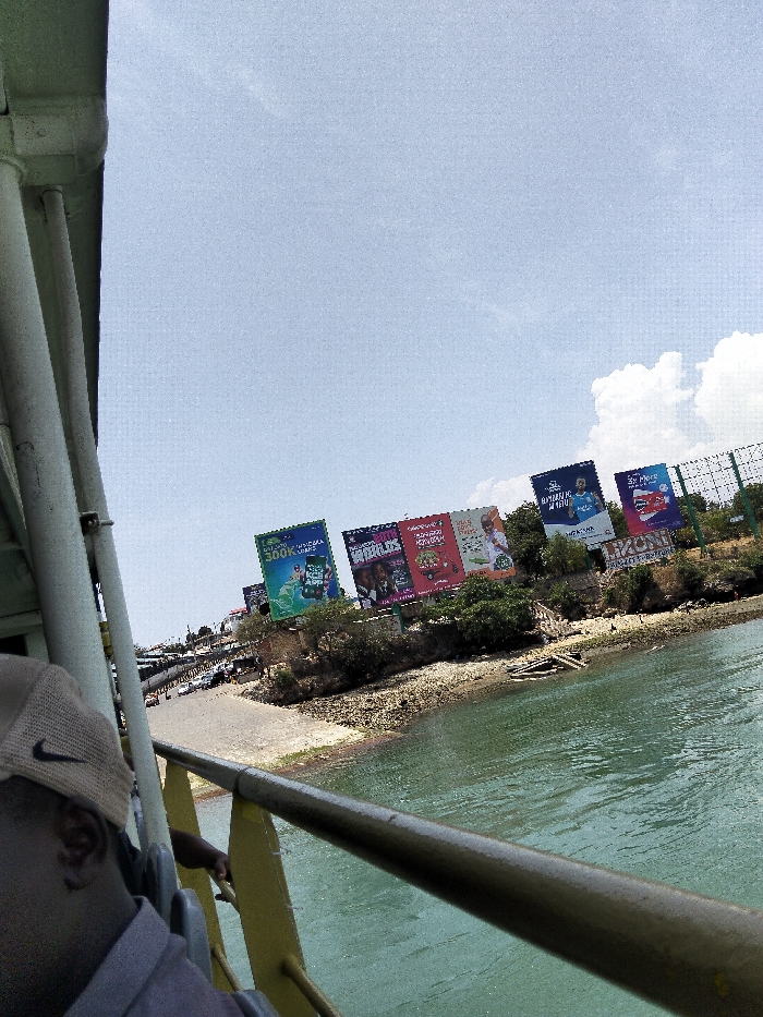 The image depicts a daytime scene from an elevated vantage point overlooking a body of water and an adjacent shoreline in Mkomani ward, Kenya. In the bottom-left quadrant, the top of an individual's head, wearing a light-colored cap with a dark Nike logo, is visible. The individual is facing away from the camera. A dark grey metal handrail extends diagonally from the lower left towards the mid-right, supported by vertical yellow structures. Further left, light grey vertical pipes suggest a structural component of the viewing platform, likely a ferry or pier. The mid-ground features a body of green-blue water with surface ripples, which meets a rocky, uneven shoreline. A road, appearing to be paved or gravel, is visible curving along the land, ascending slightly to the left. Multiple vehicles are parked or in transit on this road in the distance. An embankment beyond the shoreline supports scattered green vegetation and some visible debris near the water's edge. In the background, at least five large, brightly colored commercial billboards are prominently displayed on the landmass above the road. From left to right, they include: a green billboard with text "GET INTO 300K" and a smartphone graphic; two red/orange billboards with partial text "WORLDS" and "HARVEST" depicting people and food; a blue billboard featuring a male figure in a jersey with text mentioning "Betting in Kajiado" and "Betting in Kenya"; and another blue billboard with "35 Mere" and a vehicle graphic. A metal fence structure is discernible behind these billboards. The sky above is clear light blue with several distinct white cumulus clouds, particularly on the right side, indicating bright daylight.