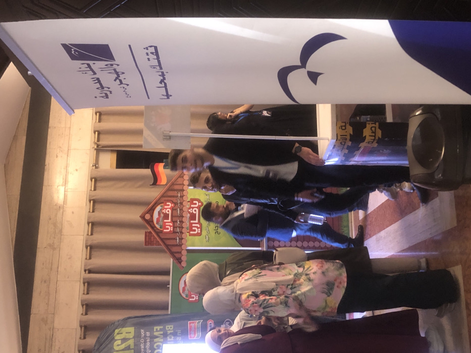 The image captures an indoor event within Al-Mazza Municipality, Syria, depicting a gathering of individuals amidst promotional displays