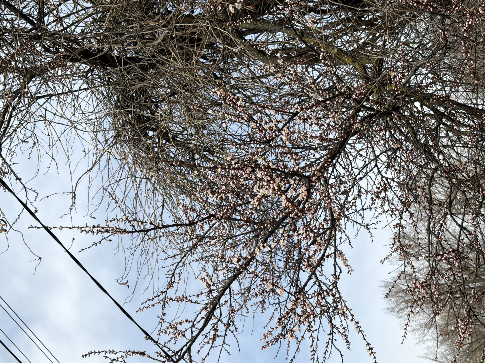 view looking up into a tree in Aksay, Russia. The branches are bare, except for numerous small buds or blossoms beginning to emerge. The sky is visible through the branches. Electrical wires run across the bottom left of the frame.