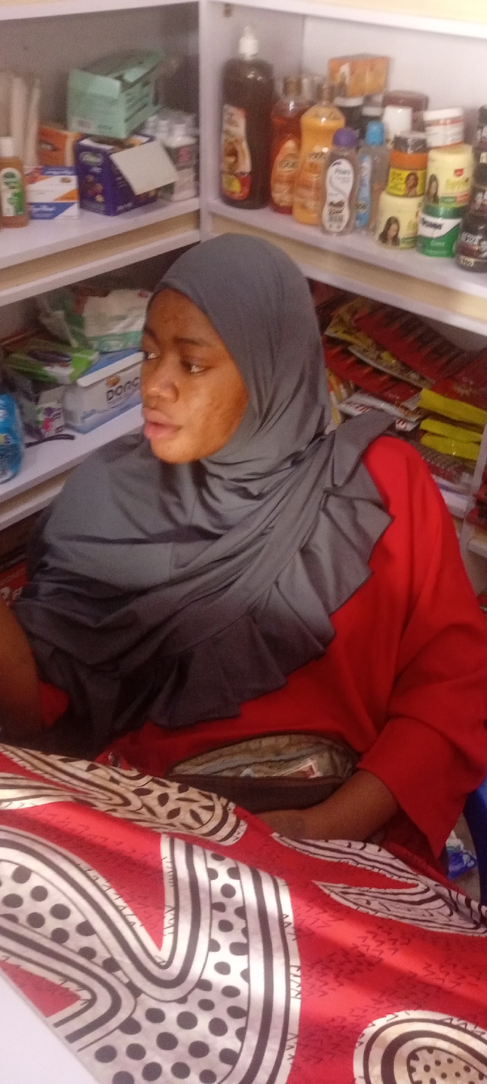 This image, taken in Gayawa, Nigeria, depicts a female individual seated within a retail environment