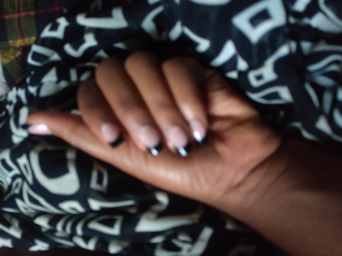 A close-up image depicts a person's right hand, characterized by a dark skin tone, positioned against a patterned fabric background. The hand is slightly flexed, with the thumb extended upwards. The fingernails are manicured with a French tip style, featuring a pale pink or nude base and distinct black tips. The tips exhibit a glossy finish, possibly indicating gel or acrylic application. The primary background consists of a black fabric with repeating white or off-white abstract shapes, resembling stylized letters or geometric designs. A smaller portion of a secondary background, a red and dark-colored plaid fabric, is visible in the upper right quadrant. The scene appears to be indoors, under diffuse lighting conditions. The specific city location of New Stadium, Nigeria, cannot be determined from the visual information presented in this image.