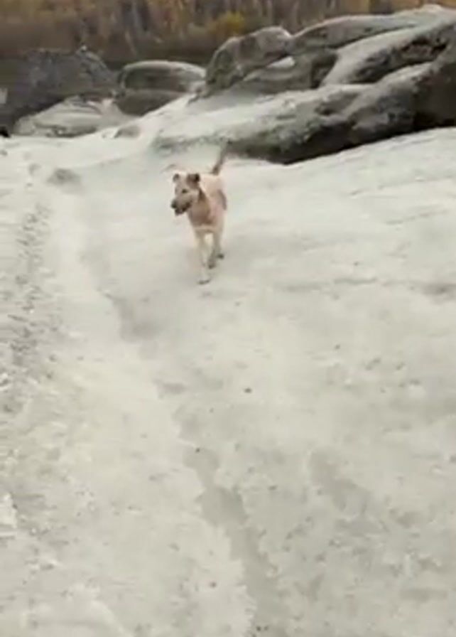 The video begins with a close-up of an irregular stone surface with two dark spots. The camera then pans up to reveal a sandy-colored dog with a white chest standing on the stone surface. The dog is panting and looking toward the camera. The camera follows the dog as it walks and then turns to the right, revealing another similar-looking dog in the distance. The first dog then starts running towards the second dog. The background shows a landscape of hills covered with trees, under an overcast sky. The ground is uneven and rocky.