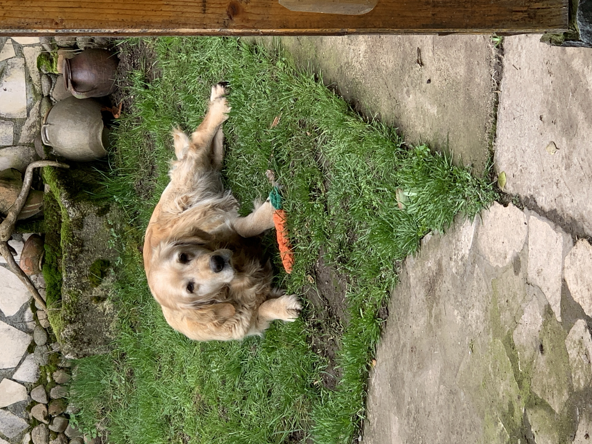 A medium-sized, light-golden retriever lies on its side in the grass. A soft toy, resembling a carrot, lies next to it. The dog has soft brown eyes and appears relaxed. To the left of the dog is a stone structure with a few clay pots. To the right of the dog is a concrete pavement. The scene is a garden, near Lehchevo, Bulgaria. A wooden frame is seen at the top of the image.