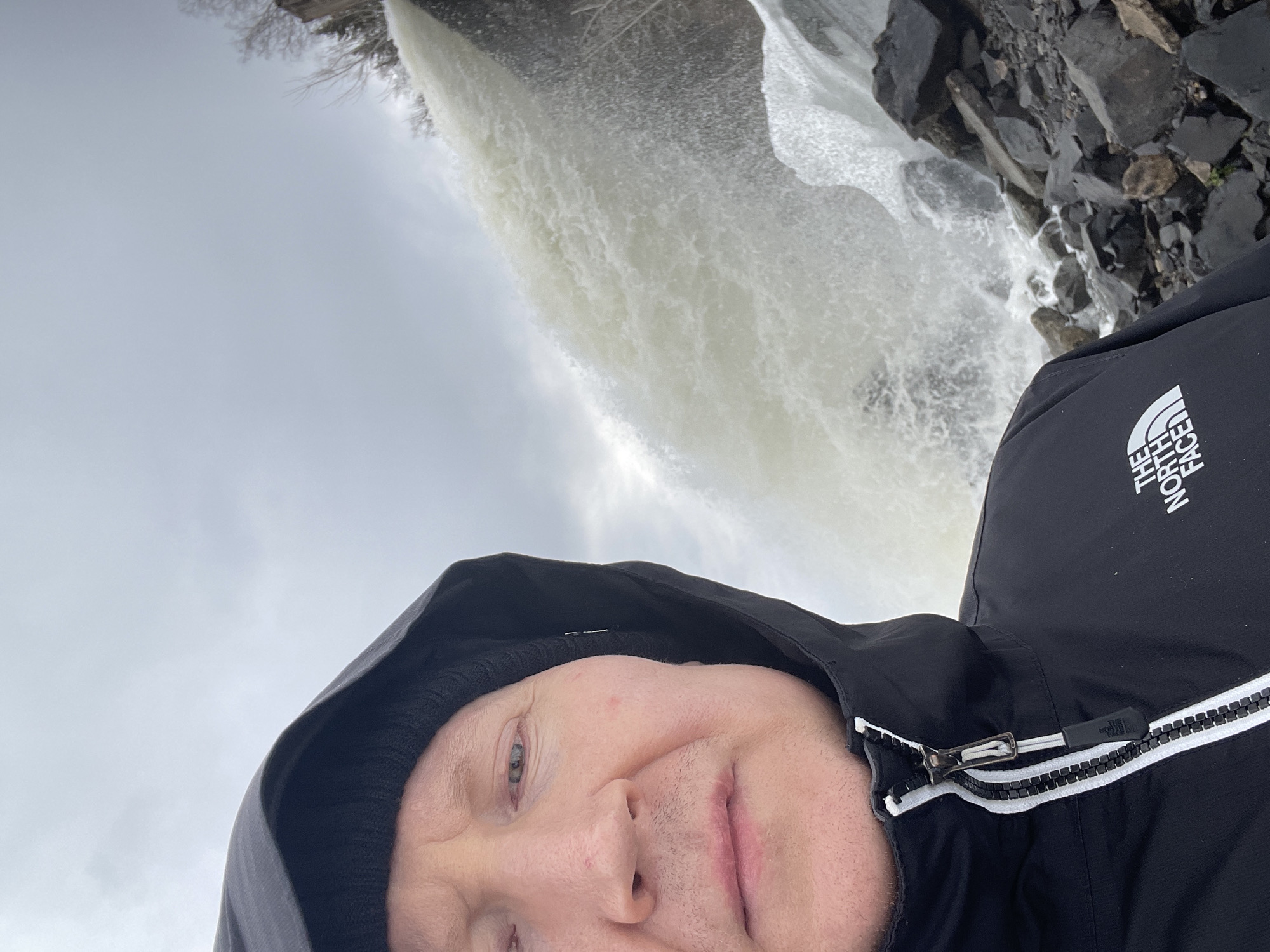 A middle-aged man in a black hooded jacket stands near a waterfall