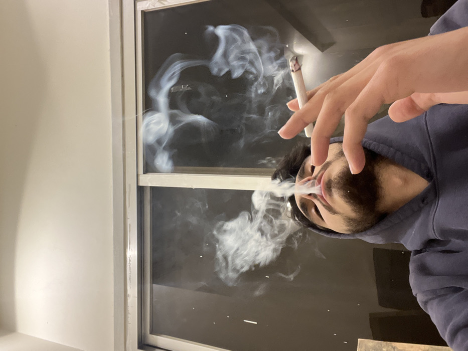 A person exhales cigarette smoke. The face is partially visible, revealing dark hair, a beard, and a blue hoodie. The individual holds a lit cigarette between their fingers. White smoke billows around the person and is visible against a dark background, which appears to be a window. A portion of the window frame is visible. The image is rotated.