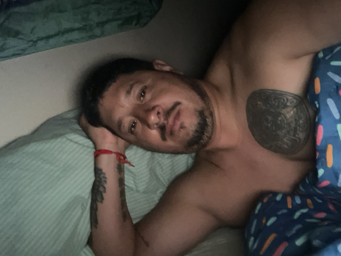A man lies on a bed with a patterned blue and white comforter. His head rests on a green striped pillow, and he gazes directly at the viewer. He has short dark hair, a mustache, and a goatee. A red string is tied around his left wrist, and a dark tattoo adorns his left arm. Another tattoo is visible on his chest. The lighting is dim, creating a cozy and intimate atmosphere.