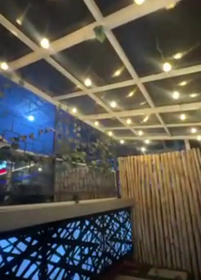 The video showcases an indoor space with a bar area. The ceiling is made of transparent panels with a white grid structure and dotted with warm-toned light bulbs. Decorative green vines are draped along the upper section of the wall behind the bar, which has a black and white geometric design. The background reveals a cityscape through a partially obscured window. A vertical bamboo partition adds texture to the right side of the frame. The atmosphere is moody, accented by blue lighting behind the bar, and music plays in the background. The video seems to be a tour or a promotional clip of the venue.