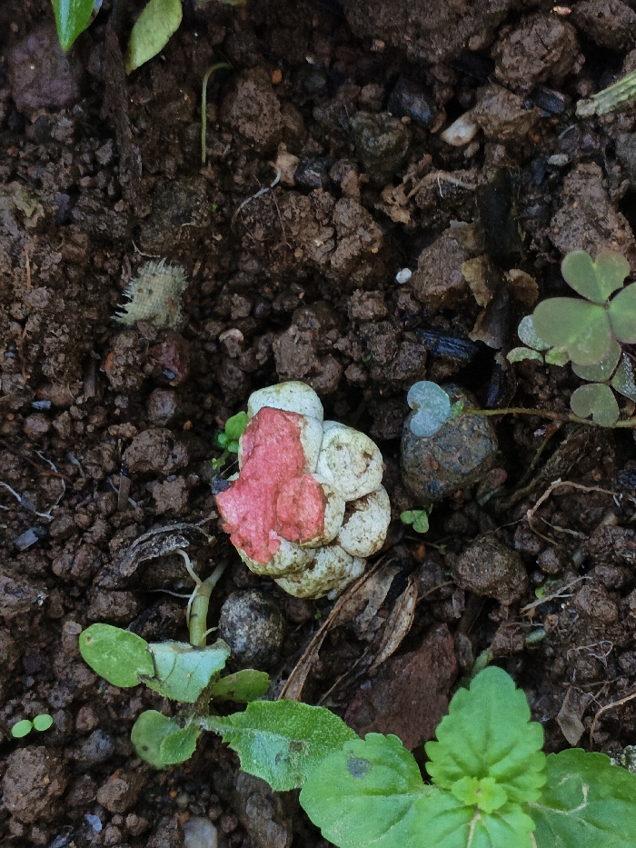 In a close-up shot of soil, a cluster of small, round, off-white fungi are partially covered with a bright red patch. Green plants with rounded leaves grow nearby, along with a three-leaf clover. Bits of decaying matter, pebbles, and plant debris are scattered across the soil surface. The overall scene is damp and earthy.