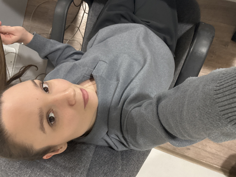 A female individual is seated in a grey office-style chair in an indoor setting, potentially within Krasnoyarsk, Russia
