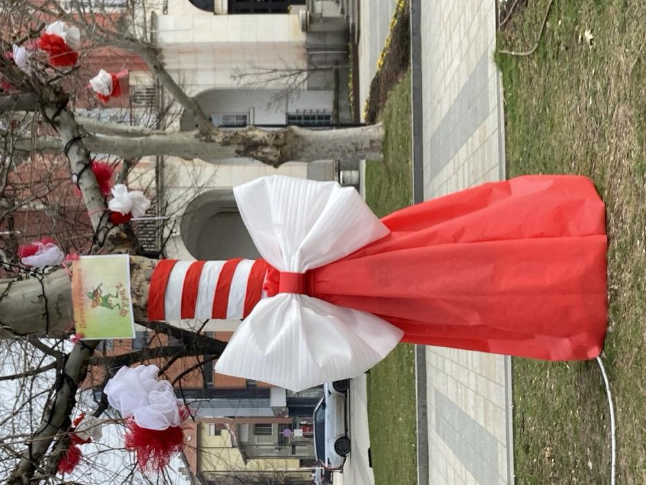 A tree in a public space in Pleven, Bulgaria, stands decorated. The lower trunk is wrapped horizontally with alternating red and white striped fabric. A large white pleated bow with a red center is affixed over this wrapping. Below the bow, the trunk is encased in a solid red fabric extending to the ground. A white electrical cable emerges from the base of the tree and crosses the adjacent grass. Higher on the trunk, a light green rectangular sign is attached, featuring red Cyrillic text "ДЕТСКА ГРАДИНА" (Children's Garden/Kindergarten) at the top, a cartoon illustration of a grasshopper playing a violin in the center, and green Cyrillic text "ЩУРЕЦ" (Cricket/Grasshopper) at the bottom. The bare branches of the tree are adorned with numerous small, spherical ornaments made of red and white mesh fabric. Dark wires are also present on some branches. The tree is situated on a patch of green grass next to a paved pedestrian walkway composed of light and dark grey square tiles. In the background on the right, a large, light-colored building with arched windows and classical columns is visible. Partial Cyrillic text "ОБЩ" is discernible on a sign on this building. To the left, a modern building with glass facades is present, with a silver SUV visible on a street beyond it. Other bare trees and a flowerbed with yellow blooms are also in the background. The sky is overcast. No people are visible in the scene.