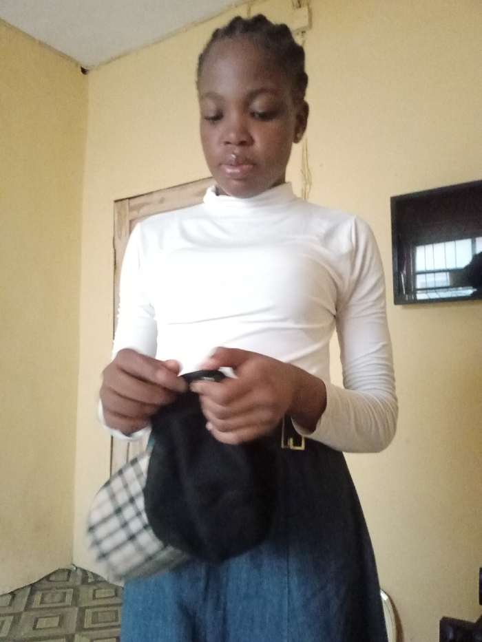 A young woman with braids stands indoors, glancing down as she holds a black hat with a beige plaid brim. She wears a white turtleneck shirt and a denim-like skirt with a visible gold belt buckle. Behind her, a doorway, a wall painted pale yellow, and a black television can be seen. The floor has a patterned tile or linoleum covering.