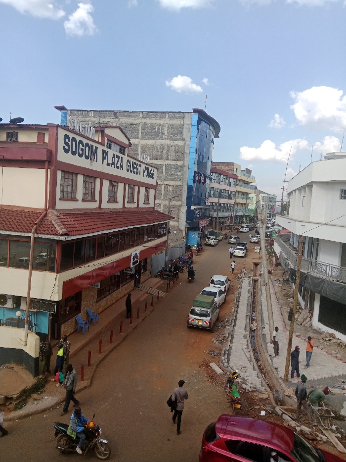 street scene in Kapsabet, Kenya, taken from a high vantage point. The focal point is a building on the left side of the image, labelled "SOGOM PLAZA GUEST HOUSE." The building is two-stories with a red roof and a white facade. The building has multiple windows, and there are several people walking in front of it. The street is paved and there are cars parked on both sides. There are several workers laying concrete blocks in the street, seemingly doing road construction. The sky is blue with some white clouds. The buildings on the right side of the image are more modern, with a glass facade, and appear to be part of a shopping center. Several trees are visible in the distance. There are many people walking around, mostly men. The scene is bustling with activity.