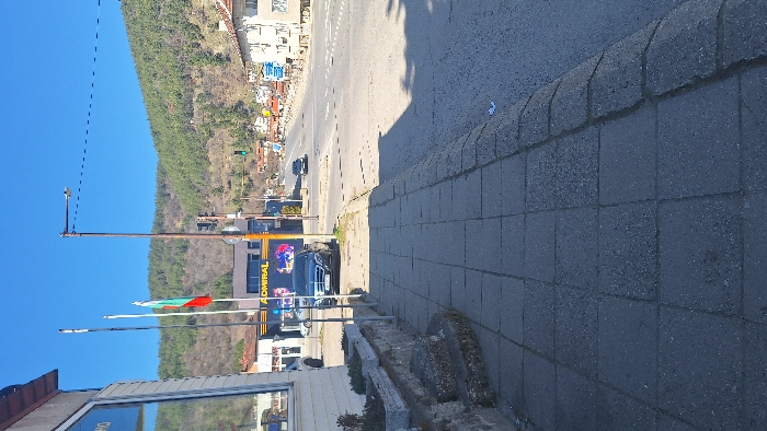 The image depicts a static street scene in Dupnitsa, Bulgaria, looking southeast from the sidewalk adjacent to ul. "Tsar Osvoboditel." The approximate location is in front of the Admiral Club at ul. "Tsar Osvoboditel" 36. In the immediate foreground, a segment of a light-colored building with vertical siding is visible on the left. Two rough-hewn concrete steps lead up to a low stone wall topped with two rectangular concrete planter boxes, each containing sparse, dormant vegetation. A gray concrete tiled sidewalk extends from the bottom of the frame towards the mid-ground, bordered on the right by a raised curb. The mid-ground features a multi-lane asphalt road, presumably ul. "Tsar Osvoboditel," with a solid white line separating traffic lanes and dashed white lines indicating crosswalks or intersections further down. A dark-colored Mercedes-Benz sedan is parked curbside facing the viewer. Directly behind the parked vehicle is a commercial building with a prominent yellow "ADMIRAL" sign above a colorful graphic display. To the right of the Admiral building, two flagpoles are visible; one displays the Bulgarian national flag, characterized by horizontal white, green, and red stripes. A tall, dark brown streetlamp with a single light fixture extends over the road. A traffic light, showing a green signal, is attached to a pole adjacent to the streetlamp. Another dark-colored vehicle is observed in the distance, traveling away from the viewer on the main road. The background is dominated by steep, tree-covered mountains under a clear, bright blue sky. Scattered residential buildings with tiled roofs are visible along the right side of the road in the distance, nestled against the foothills. The scene is illuminated by direct sunlight, casting shadows on the right side of the road and sidewalk. No individuals are discernible within the frame.