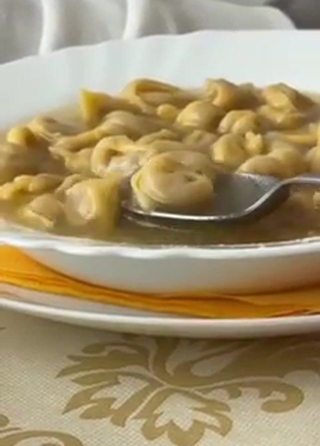 A close-up shot shows a white bowl filled with tortellini in broth, resting on an orange napkin