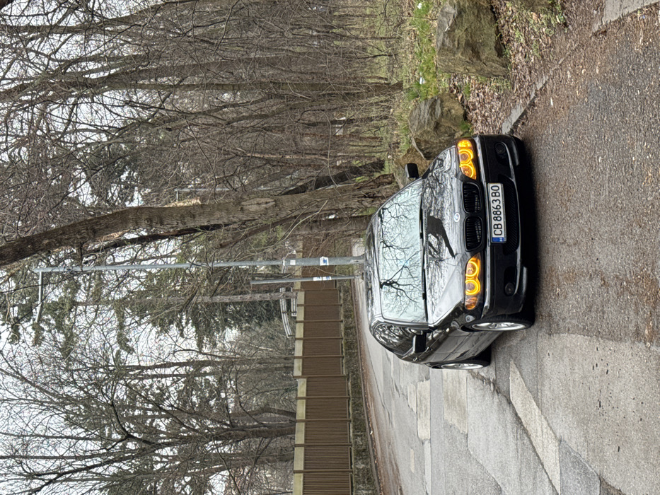 A black BMW E46 sedan is parked on the right side of an asphalt road, facing forward and slightly angled towards the camera. The vehicle features custom yellow/amber "angel eyes" illumination in its headlights and displays Bulgarian license plate "CB 8863 BO" on its front bumper, indicating registration in Sofia. The road exhibits cracks and patches, curving slightly to the left beyond the vehicle. To the left of the road, a brown, slatted fence runs atop an elevated embankment, behind which various bare deciduous trees and some evergreen trees are visible. To the right of the car, a forested or park-like area with numerous bare deciduous trees and undergrowth is present, along with several large natural rocks and a prominent tree trunk in the foreground. A tall, slender gray lamppost or utility pole stands directly in front of the car's position. The overall environment suggests a park-like setting or a road bordering a wooded area within Sofia, Bulgaria, likely during late autumn, winter, or early spring due to the lack of foliage on most trees. The sky is overcast. No individuals are present in the scene.