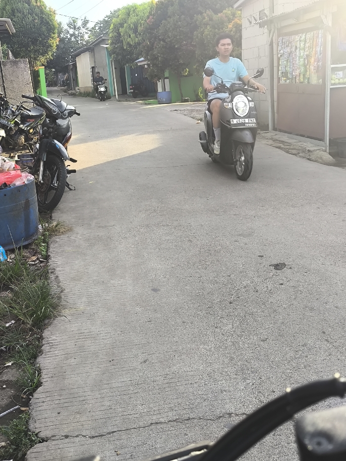 The image displays a residential street in an unknown city, Indonesia, illuminated by bright daylight. A young male, wearing a light blue t-shirt, dark shorts, and white shoes with socks, operates a dark grey Honda Scoopy scooter (license plate B 4628 FNE) in the midground, facing forward with hands on the handlebars. On the left side of the concrete roadway, several motorcycles are parked alongside a blue plastic barrel filled with refuse. Grass and weeds line the edge of the road. In the background, residential buildings of varying colors and numerous trees are visible. Further down the street, a second male on a dark motorcycle is observed moving away. The right side of the street features a building with a brown door and a storefront display exhibiting hanging merchandise and produce. Strong sunlight is present, casting shadows to the right and causing a lens flare in the upper right of the frame.