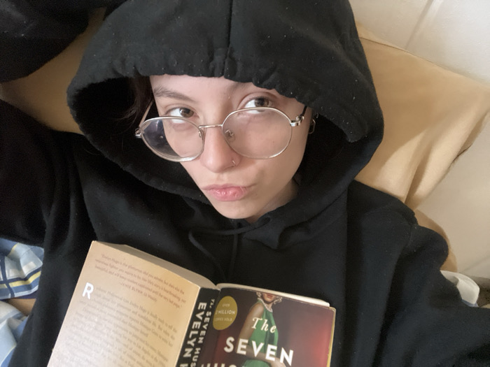 A person wearing glasses and a black hoodie is lying down while reading a book. The book is open, with the cover of "The Seven Husbands of Evelyn Hugo" visible. They have a nose piercing and are looking at the camera with a slight pout. Part of a pillow and a blue and white patterned blanket can be seen in the background. The image is taken from a slightly high angle.