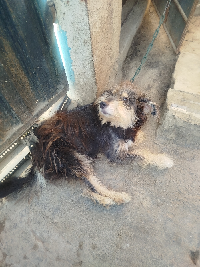 A medium-sized, scruffy dog lies on a concrete surface next to a rusted metal gate and a weathered wall. The dog has a dark brown and black coat with white markings on its paws and muzzle. A metal chain is loosely attached to its collar, and it looks upwards with a gentle expression. The environment appears to be an outdoor area, possibly a backyard or courtyard.