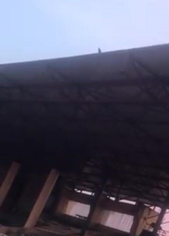 bird perched on the corrugated metal roof of a large, dark structure. The roof appears to be supported by a metal frame, which is visible from the underside along with some wooden supports. The camera angle is low, looking upwards, and the sky is visible in the background, appearing light blue or gray. The overall impression is that the structure is large and possibly industrial or agricultural in nature.