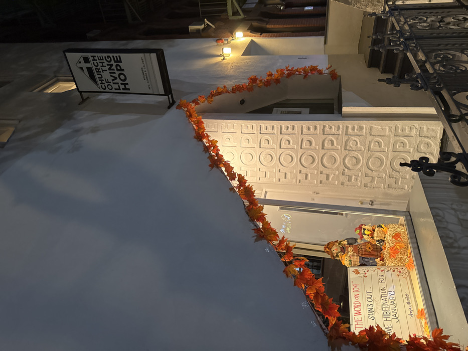 The image displays the exterior of the Church of the Living Hope, located at 104 West 119th Street in Manhattan, New York City, United States, during nighttime. The building's light-colored facade is illuminated by artificial light. A vertical sign affixed to the building reads "CHURCH OF THE LIVING HOPE" above a logo depicting a cross and "FOUNDER REV. GEORGE E. CALVERT." A garland of orange artificial maple leaves is draped along the facade, outlining a display window and a recessed entrance. The entrance features repetitive, embossed "HOPE" lettering vertically stacked. Inside the internally lit display window, an autumn-themed vignette includes a scarecrow figure wearing a plaid shirt and overalls, holding a basket with a pumpkin, alongside a smaller turkey-like figure positioned on a straw bale. A white sign within the window displays handwritten text: "THE WORD ON 104'", "SUNS OUT...", "AVE HIBERNATION FOR JANUARY!", and a signature "~Soji Alubo". To the right of the entrance, an outdoor staircase with dark, ornate metal railings ascends, with two wall-mounted lights illuminating the area. A decorative dark metal fence is visible in the lower foreground. No people are present in the scene.