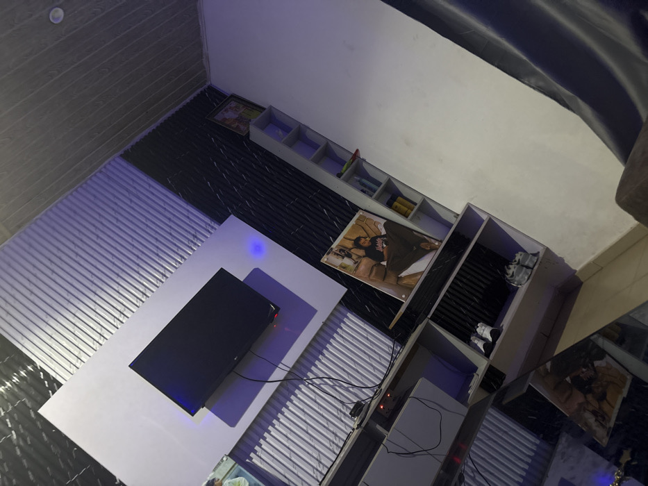 A contemporary interior featuring a white coffee table with a black television on top. The room is decorated with sleek, marble-patterned flooring and horizontally striped walls. A series of shelving units with objects are mounted along the wall, adjacent to the TV, with photo frames placed atop the shelving. The ceiling is textured and off-white. The room uses cool lighting.
