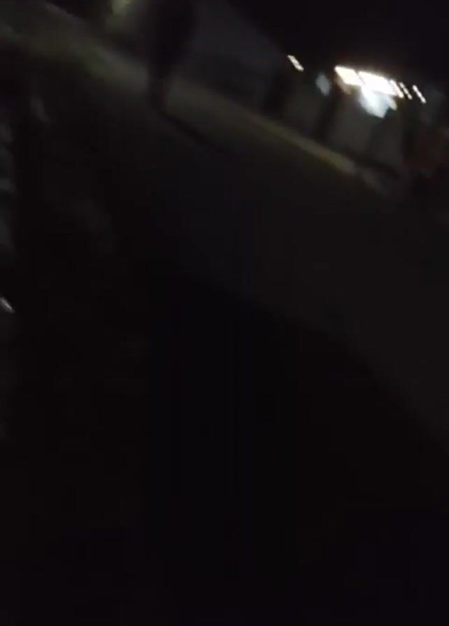 dark street at night. There is a figure standing in the middle of the street, illuminated by streetlights. There are buildings on either side of the street, also illuminated by streetlights. The camera is shaky and appears to be hand-held.