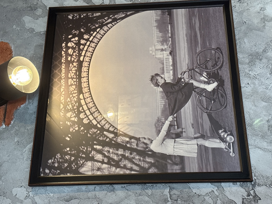 A framed black and white photograph hangs on a mottled grey wall, accented with visible red brick and illuminated by a ceiling-mounted black spotlight featuring an exposed incandescent bulb. This installation is located in Sofia, Bulgaria. The photograph depicts an outdoor scene with two children. On the left, a girl, approximately 6-8 years old, with light hair and dressed in a light-colored long-sleeved top and a patterned skirt, rides a three-wheeled scooter. She propels herself with her right foot and extends her left hand to grasp the back of the coat worn by a second, younger child to her right. The younger child, approximately 4-6 years old and wearing a dark coat, is seated on and pedaling a small, dark-colored bicycle. The dark coat is visibly pulled taut and billows slightly upwards from the girl's grip. The background features the distinctive lattice structure and arch of the Eiffel Tower, silhouetted against a lighter sky. Further in the mid-ground, several large, classical-style buildings with prominent columns are visible, consistent with Parisian architecture. The children are on a paved surface, and their shadows are cast to the left, indicating a bright, sunlit environment.