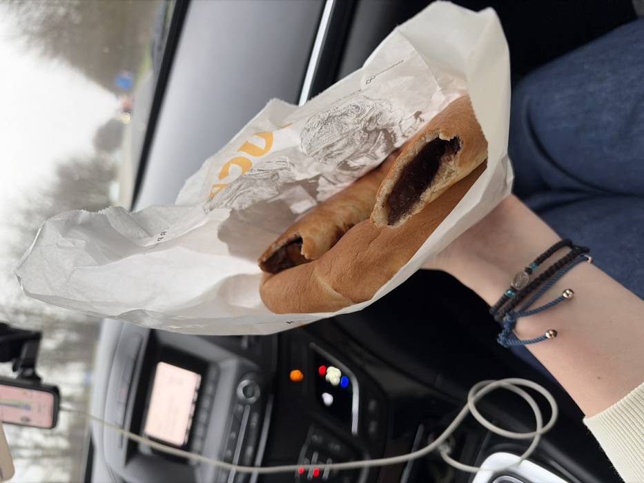 The scene is set within a vehicle on a road in Costinești, Romania. The foreground features a person's right forearm and hand, wearing a light-colored long-sleeved garment and blue jeans. The wrist is adorned with four bracelets: two dark blue string bracelets with small metallic beads, and two black braided string bracelets, one with a small circular charm and a light blue bead. The hand is holding a partially crumpled white paper bag containing four elongated, baked pastries with a visible dark, reddish-brown filling. One pastry is broken, exposing the filling clearly. Partial orange lettering is visible on the bag's interior. The background reveals the interior of a car, specifically the dark-colored dashboard and front windshield. A smartphone is mounted on the dashboard, displaying a navigation application, and is connected by a white charging cable. The car's central infotainment screen is visible, along with illuminated control buttons (orange and blue lights). Through the windshield, a blurry external environment is visible: a road with distant vehicles and trees, suggesting movement or being stationary on a roadway under an overcast sky.