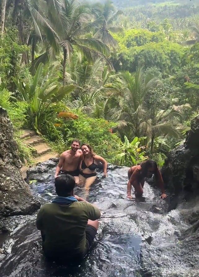 four people at a natural pool or waterfall in a tropical environment. A couple is sitting in the water, embracing, while a third person kneels on the rocky edge of the pool. A fourth person, wearing a green shirt and shorts, is sitting on the rocks and taking photos of the couple. The pool is surrounded by lush green vegetation, including palm trees. In the background, there is a view of hills and valleys covered in trees. The water in the pool is clear and the rocks are dark. The overall scene suggests a vacation or outing in a natural setting.