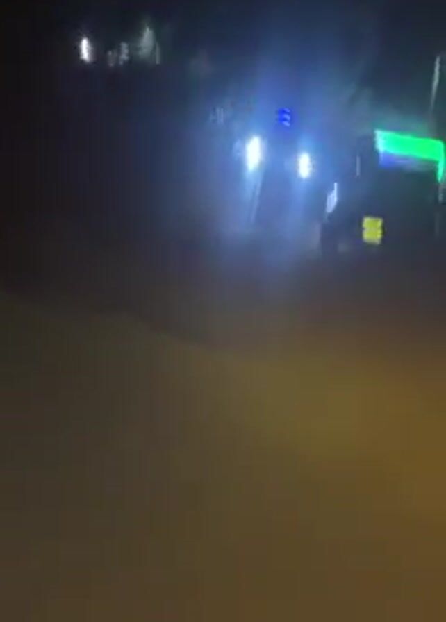 At night, a vehicle with brightly illuminated headlights and a light bar on top, colored red and purple, is parked on what appears to be a road or driveway. A person walks past the front of the vehicle. The vehicle's license plate, which is yellow, is visible. A metallic fence is visible behind the vehicle.