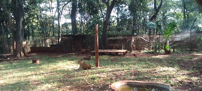 The image displays an outdoor animal enclosure located in Athi River ward, Kenya. A single subadult lion, with light tan fur, is observed lying on its belly on a patch of sparse green grass in the lower-middle left portion of the frame, facing slightly to the right. A prominent, dark brown wooden post stands vertically in the mid-ground, slightly to the left of the image center, positioned in front of the lion. To the right of this post and behind the lion, a low, square wooden platform made of planks is visible on the reddish-brown soil. In the lower right foreground, a portion of an irregularly shaped, shallow stone or concrete basin containing water is present. Further to the left, near the base of a large tree trunk, a cylindrical concrete object rests on the ground. The background of the enclosure is secured by a tall chain-link fence, topped with additional wire, extending horizontally across the entire width of the scene. Behind this primary fence, several dark, structured enclosures and additional fencing are visible, along with dense green foliage from numerous tall trees. A small, light green palm-like plant is situated in front of the background fence on the right side. The ground within the enclosure consists of a mix of reddish-brown soil and patches of green grass. No human subjects are visible.