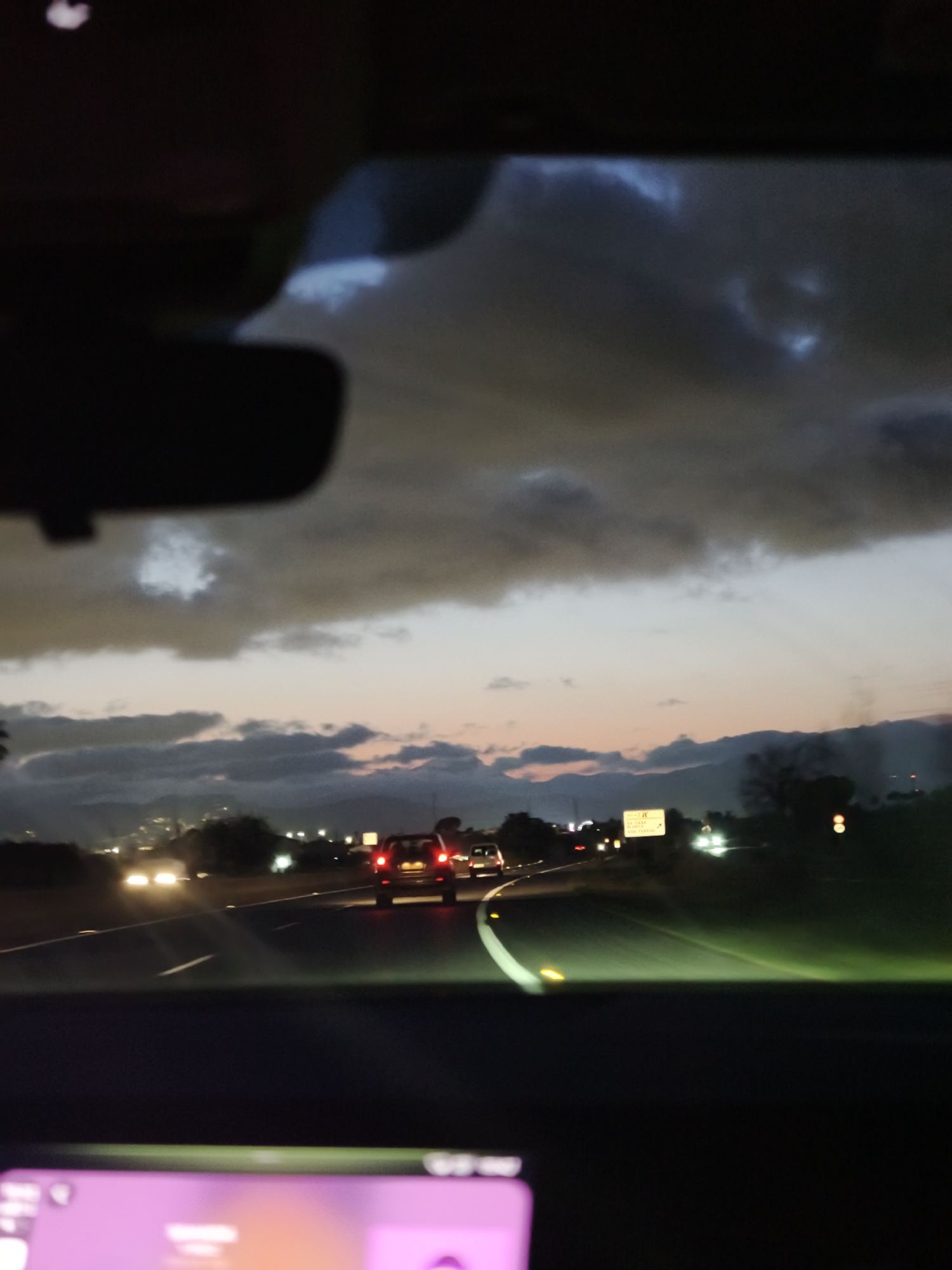 The image depicts a twilight scene from the interior of a vehicle on a multi-lane highway in Palma de Mallorca, Spain. The viewpoint is through the windshield, looking forward. The sky is largely obscured by dark, heavy clouds overhead, transitioning to a lighter grey and faint orange/pink near the horizon. Distant mountains or hills are visible, topped with a scattering of city lights. In the foreground, the silhouette of a rearview mirror is present at the top-center. The bottom of the image shows a blurred electronic screen, possibly an infotainment display, emitting a magenta-purple glow. The road ahead is illuminated by the vehicle's headlights, casting a green-tinged light. White dashed lane markers are visible on the asphalt. Yellow reflective road markers are illuminated along the right edge of the road, indicating a curve. Ahead, a dark-colored SUV or similar vehicle is visible with its red tail lights illuminated. Further down the road, other vehicle headlights and tail lights are faintly discernible. On the right side of the road, a yellow rectangular road sign with black text is visible, partially reading "IV", "SA CASA", "SA TORRE", and "SES TERRES," which are place names consistent with the Palma de Mallorca region. No individuals are directly visible; the scene implies a driver is operating the vehicle.