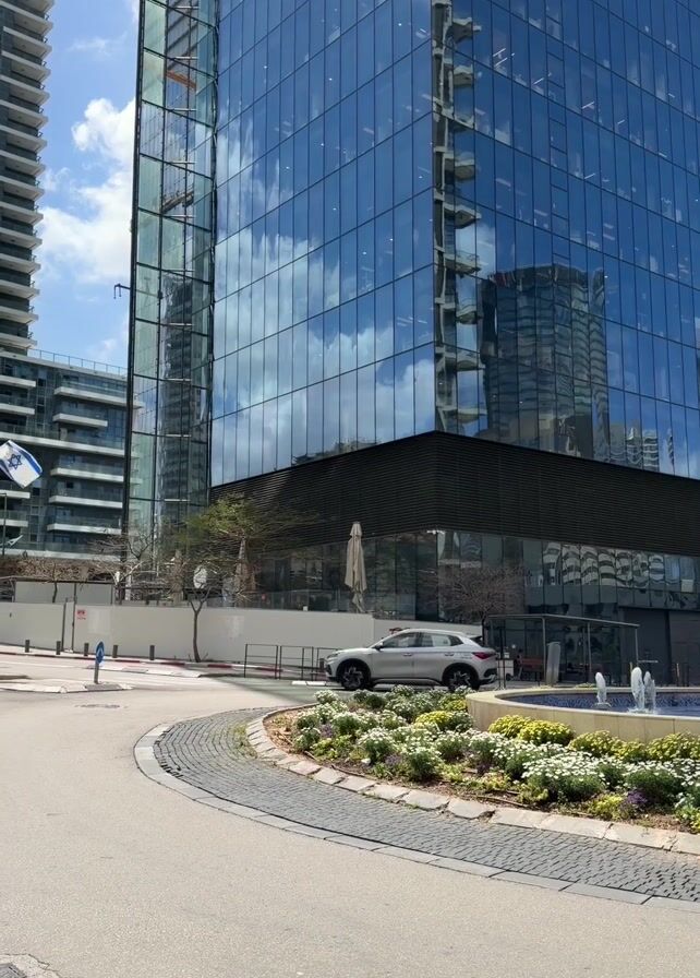modern urban scene with a tall glass building reflecting the sky and clouds. In front of the building is a roundabout with a small, well-maintained garden featuring white flowers and a fountain. A white SUV is driving around the roundabout. There is a blue and white flag visible on a nearby building. The overall impression is one of a modern, clean, and prosperous urban environment.
