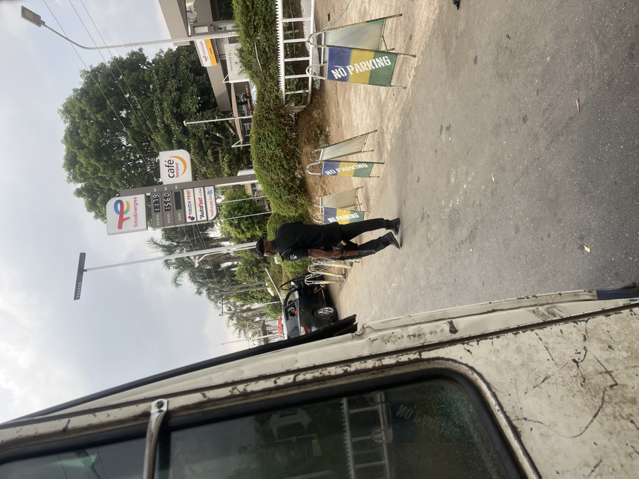 The image depicts an outdoor scene at a TotalEnergies petrol station in Abuja, Nigeria, under an overcast sky. In the foreground on the left, the weathered, white exterior and window frame of a vehicle, possibly a bus or van, partially obscure the view. In the midground, a male individual in a dark uniform, consistent with that of the Nigerian Police Force, wears a dark cap and walks from right to left, facing away from the camera. He carries a dark-colored rifle slung across his back. Behind him, a dark-colored SUV is parked with its front passenger door open. A line of four portable "NO PARKING" signs, featuring blue, green, and yellow panels with white text, is arranged on the asphalt pavement. In the background, a tall TotalEnergies sign displays current fuel prices: Petrol ₦1179 and Diesel ₦1560. Below this, signs for "Café bonjour," "TOUCH POINT," "AutoFast," and "TotalEnergies Card" are visible. Lush green trees and manicured shrubs frame the station area. Streetlights with attached solar panels are also present. The ground consists of dark asphalt.