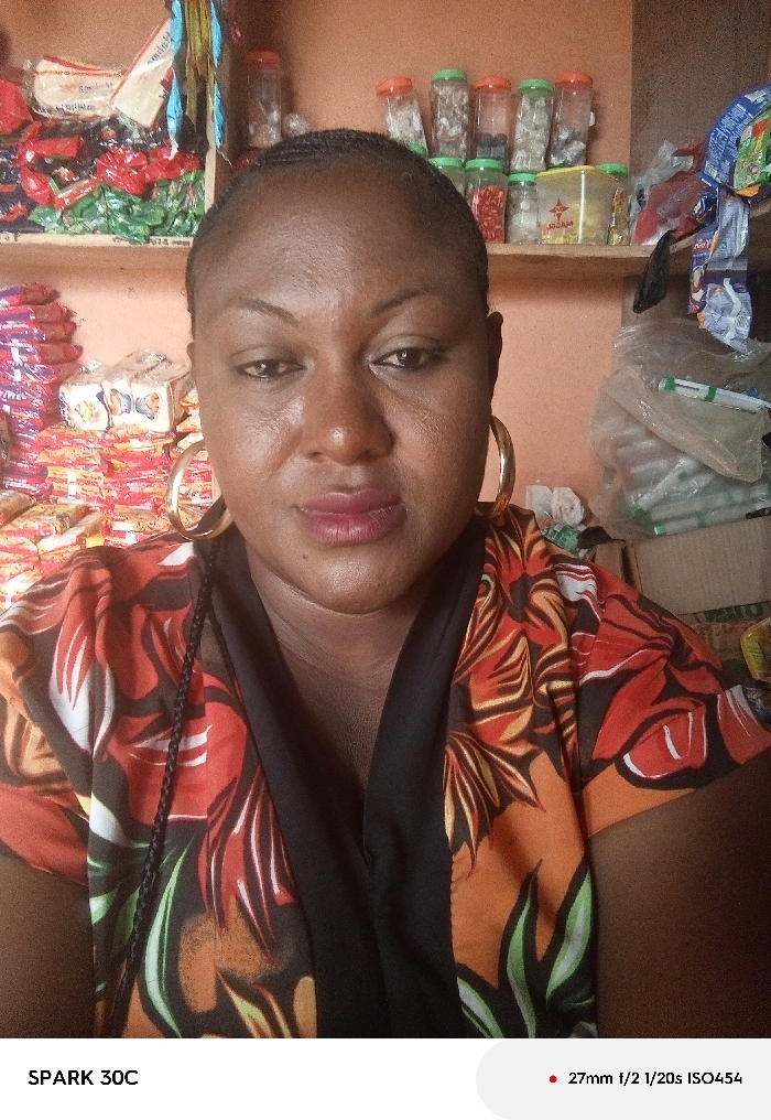 A woman with dark skin and gold hoop earrings poses for a selfie. She wears a colorful floral-patterned top with a black V-neck insert. Her hair is neatly braided. Behind her is a shelf stocked with various food products and jars, suggesting a small store or pantry setting. The lighting is somewhat dim, and the image has the technical details of the camera used to take the photo.