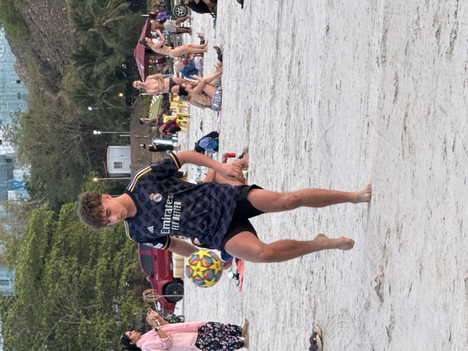 The scene depicts Cenang Beach, Malaysia, under natural light, likely during late afternoon. In the foreground, a young Caucasian male, with short brown hair, wears a dark blue Adidas Real Madrid jersey with "Emirates FLY BETTER" sponsorship and black shorts. He is barefoot, actively juggling a multicolored soccer ball (yellow, blue, black) with his right foot while his left foot is airborne. To the left of the primary subject, a woman of South Asian appearance, dressed in a light pink long-sleeved top and dark patterned trousers, stands barefoot, with her hands raised. Behind her, a red pickup truck is parked facing right. A pair of sandals rests on the sand nearby. In the midground, various individuals are present: a couple sits on a light-colored blanket, with the visible woman holding a smartphone. A bald man in dark swim trunks stands facing forward, arms crossed. A woman in a dark bikini stands, seemingly adjusting something or taking a picture, facing towards the right. Further back, individuals are seated on yellow plastic chairs under a red umbrella. The environment consists of light-colored sand across the foreground and midground, showing subtle textures and footprints. The background features dense green vegetation, including palm trees, rising into hills. A small white building with a dark roof is visible among the trees. On a distant hill in the upper left, structures suggesting construction or scaffolding are partially visible.