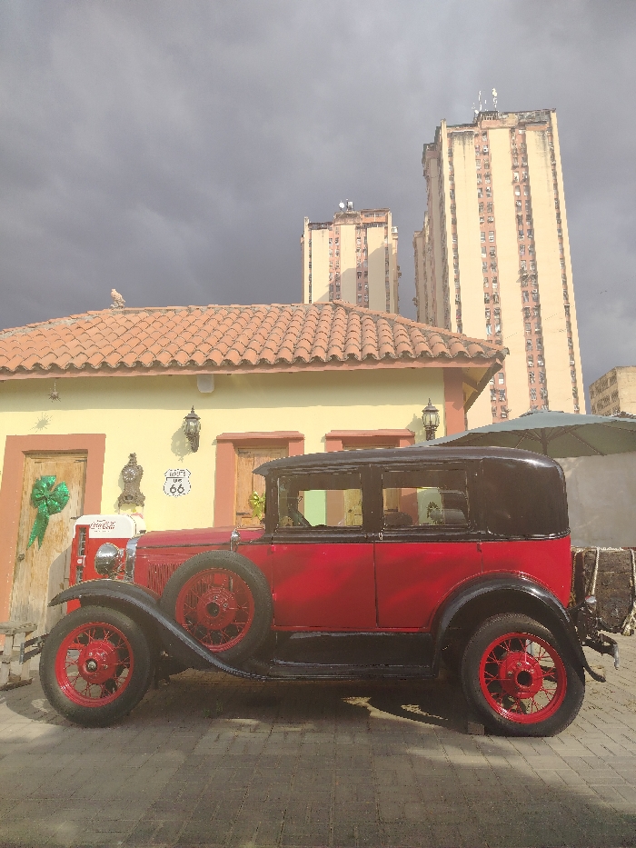 - "A red and black vintage car is parked in front of a yellow building with a red tiled roof" by FM-qNIlA2, licensed under CC BY 4.0
