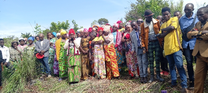 This image depicts approximately 40-50 individuals gathered outdoors in Namisha, Democratic Republic of the Congo