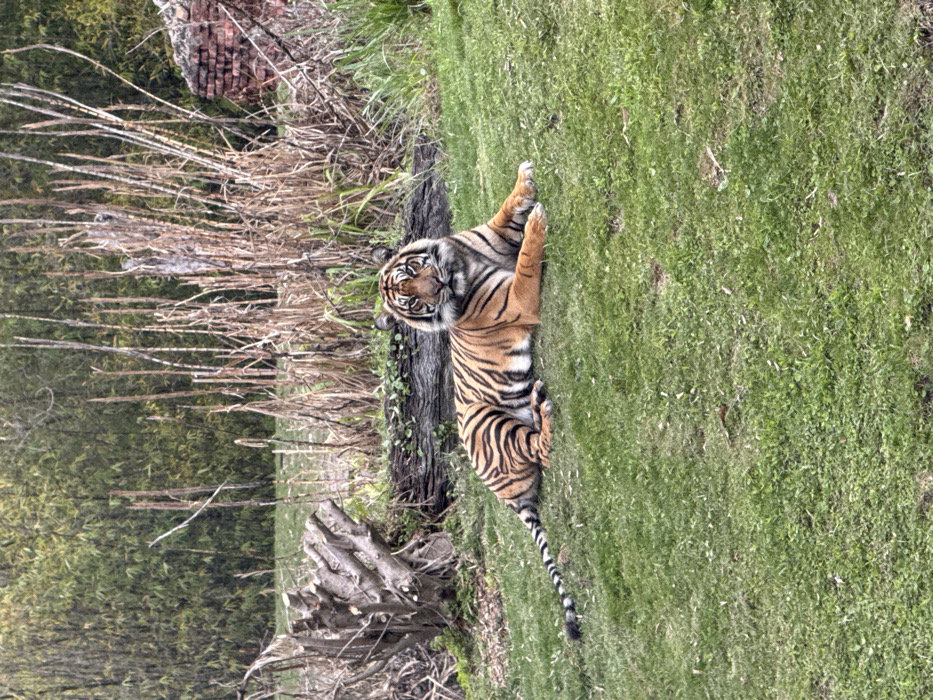 - "An adult Sumatran tiger (Panthera tigris sumatrae) is captured in a resting position, lying prone on a grassy incline and facing directly towards the observer" by FM-62dDj2, licensed under CC BY 4.0