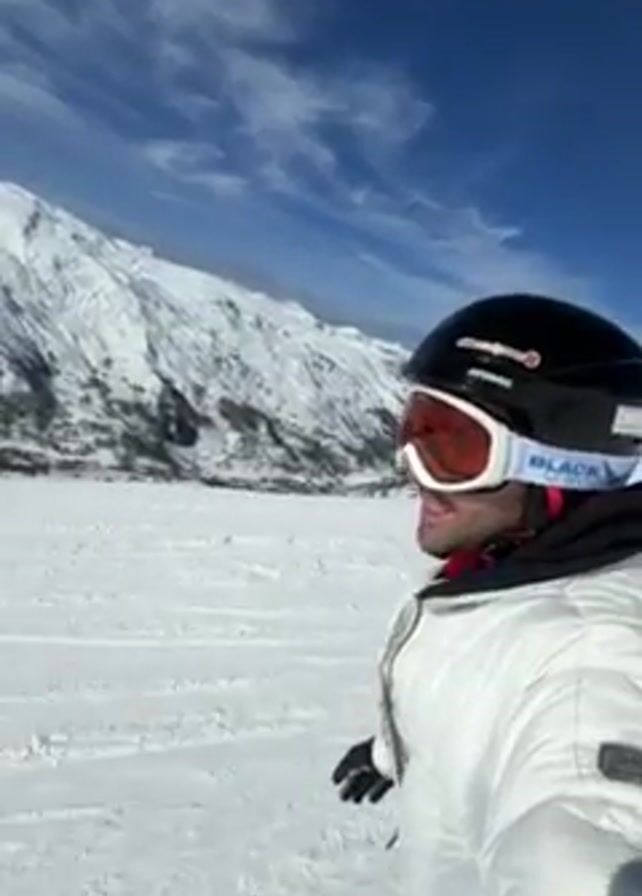 person skiing on a snowy mountain. The person is wearing a white ski jacket, black helmet, and goggles. The background shows snow-covered mountains and a blue sky with some clouds. The person points towards the mountains in the background. The camera angle is from the person's perspective, suggesting they are recording themselves while skiing. The snow has lines that appear to be from other skiers.
