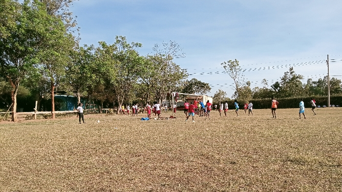 On a grassy field, several people are playing a game. They are wearing various colors, including red, white, blue, and orange. A makeshift goalpost stands near the center of the group. In the background, there are trees and a clear blue sky. A person is kicking a ball by themselves on the left side of the field. The ground is dry and the grass is brown.