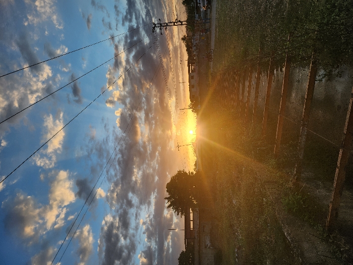 The image depicts an outdoor scene at sunset in Tinaquillo, Venezuela. The sun, a bright orb with intense lens flare and radial light rays, is positioned low on the horizon, slightly left of the image's vertical center, casting a warm, golden light across the landscape. The sky above is a mix of deep blue and scattered cumulus clouds, with the clouds near the horizon exhibiting orange and yellow hues from the setting sun. Multiple dark power lines, some appearing as dotted lines due to artifacts, traverse the upper two-thirds of the frame diagonally and horizontally. In the foreground, a narrow, water-filled channel or drainage ditch extends from the bottom center towards the horizon, spanned by approximately ten weathered, dark horizontal beams, possibly wood or metal, spaced irregularly. The ground immediately surrounding this channel is unpaved and covered with dry, sparse green and brown vegetation. On the left side of the midground, a dark green deciduous tree is visible, silhouetted against the bright sun. Behind the tree, a light-colored, possibly concrete, building structure with open framing is partially visible. On the right side of the midground and background, an unpaved or dirt road runs roughly parallel to the horizon. On this road, several human figures are discernible: at least two individuals are grouped near a parked or slow-moving motorcycle, and further right, near a light-colored vehicle (possibly a truck or SUV), additional figures are present. A tall utility pole with multiple cross arms and wires stands prominently on the far right. The overall environment suggests a semi-urban or transitional area with mixed infrastructure and natural elements.