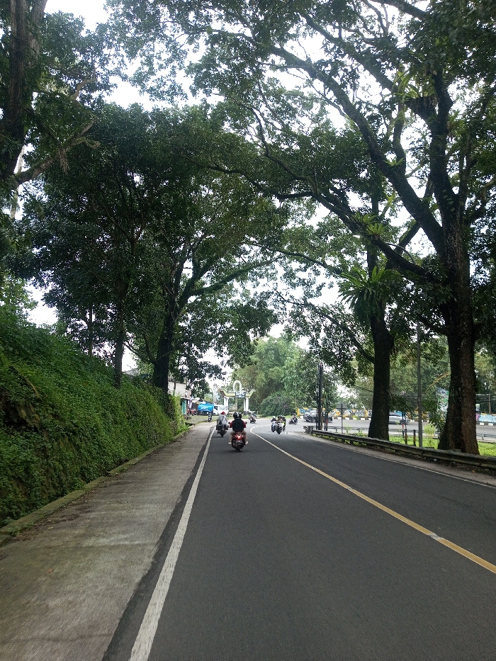 The image displays a two-lane asphalt road in Sandamal Eliya, Sri Lanka, under a bright, overcast sky. On the left, a concrete sidewalk runs alongside a steep embankment densely covered with green foliage. Large trees with extensive green canopies, some bearing epiphytic ferns, line both sides of the road. The asphalt road features a solid white line marking its left edge and a double yellow line down its center. Several individuals on motorcycles are observed traveling away from the viewer. One motorcyclist, wearing a dark helmet and jacket, is prominent in the foreground on a dark-colored motorcycle. Behind them, another motorcyclist in a light helmet is visible, followed by a cluster of approximately three to four additional motorcycles further down the road. A metal guardrail runs along the right side of the roadway. In the distant background, a white, multi-columned archway structure is visible, with faint glimpses of buildings featuring light-colored walls and blue roofs beyond it.