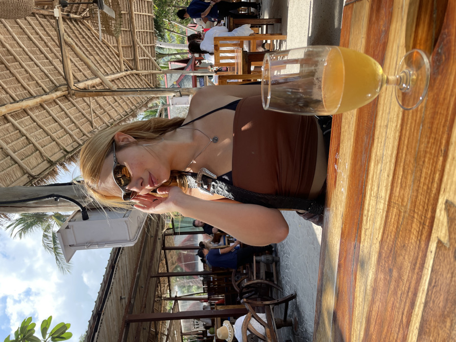 A woman with sunglasses is at a restaurant or bar, with a drink next to her on a wooden table. She is wearing a brown top and a decorative belt. The building appears to be open air with a thatched roof. Other patrons can be seen in the background. The photo is taken from a high angle and is slightly rotated.