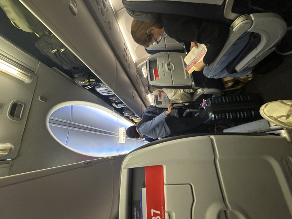 The image depicts the interior of a commercial aircraft cabin, likely a Boeing 737, with passengers either boarding or deplaning