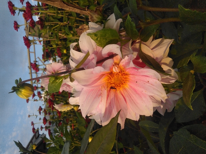 The image depicts a close-up of a garden scene in Paktho, Laos, at what appears to be dawn or early morning. In the immediate foreground, a large, light pink and white dahlia flower with an orange-yellow center is prominent, covered in visible dew droplets. A small, dark insect is present on the dahlia's orange-yellow center. Adjacent to this main flower, a green flower bud on a stem extends upwards. Surrounding the primary dahlia are its dark green leaves, also covered in dew, along with other dahlia flowers in various stages of bloom, including a partial pink flower to the right and a lighter-colored flower behind it. In the mid-ground and background, numerous taller, dark red zinnia-like flowers stand in rows, indicative of a cultivated flower bed or field. Visible structures include a partial building roof on the far left and a metal support frame among the red flowers on the right. A wooden stake is partially visible on the far right. The sky overhead is a clear light blue with faint white cloud formations. The scene is illuminated by soft, natural light.