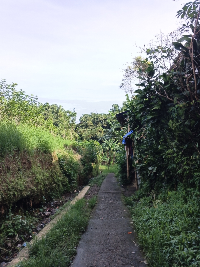 A narrow concrete path leads through dense greenery. On the left, a ditch filled with debris borders a steep bank covered in moss and tall grass. Lush foliage and trees line both sides of the path, creating a tunnel-like effect. A small, makeshift structure with a blue tarp roof is visible on the right, partially obscured by vegetation. The sky is overcast.