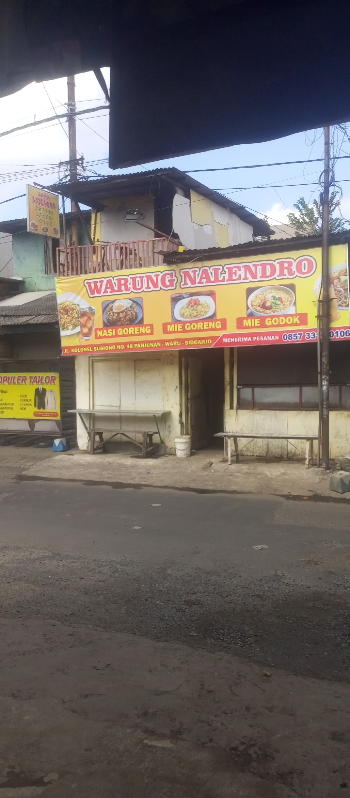street-level view of a storefront in Kecamatan Waru, Indonesia, located at the coordinates -7.35 latitude and 112.764 longitude. The storefront is painted yellow with red and white lettering. The signage above the door reads "Warung Nalendro" with pictures of various food items. The words "Nasi Goreng," "Mie Goreng," and "Mie Godok" are printed below the food pictures. The sign also indicates that they accept orders by phone. The storefront is situated on a paved street. The street is lined with two wooden benches, one on each side of the storefront. Two white buckets are positioned on the ground outside the storefront. A sign for a tailor shop is visible on the left side of the image. The image is taken in the daytime. The sky is clear and the weather is sunny. There are no people or other visible animals in the image.