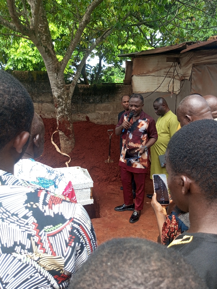 The image depicts an outdoor burial ceremony occurring in Oko Town, Nigeria