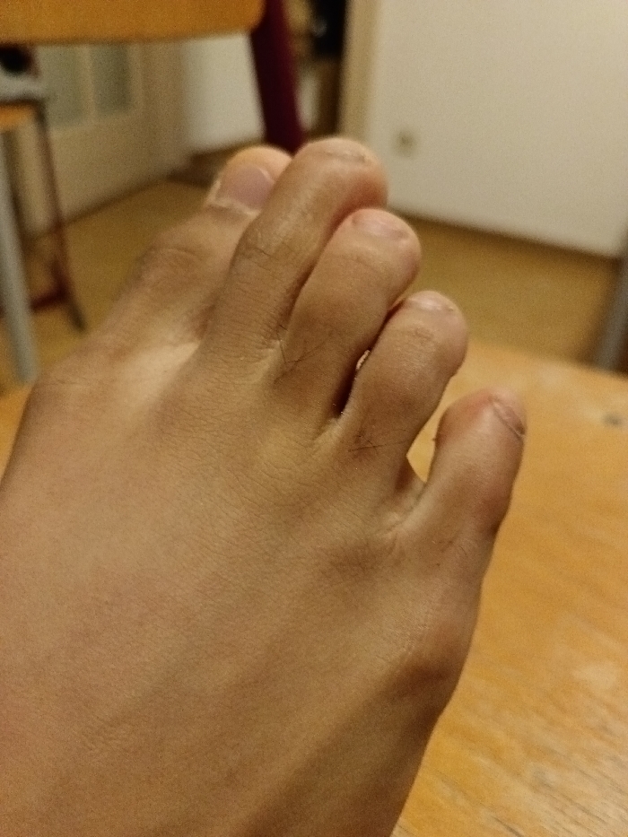 - "A human right foot with medium skin tone is depicted in a close-up, downward-angled view, resting on a light-colored wooden surface" by FM-rFWs12, licensed under CC BY 4.0
